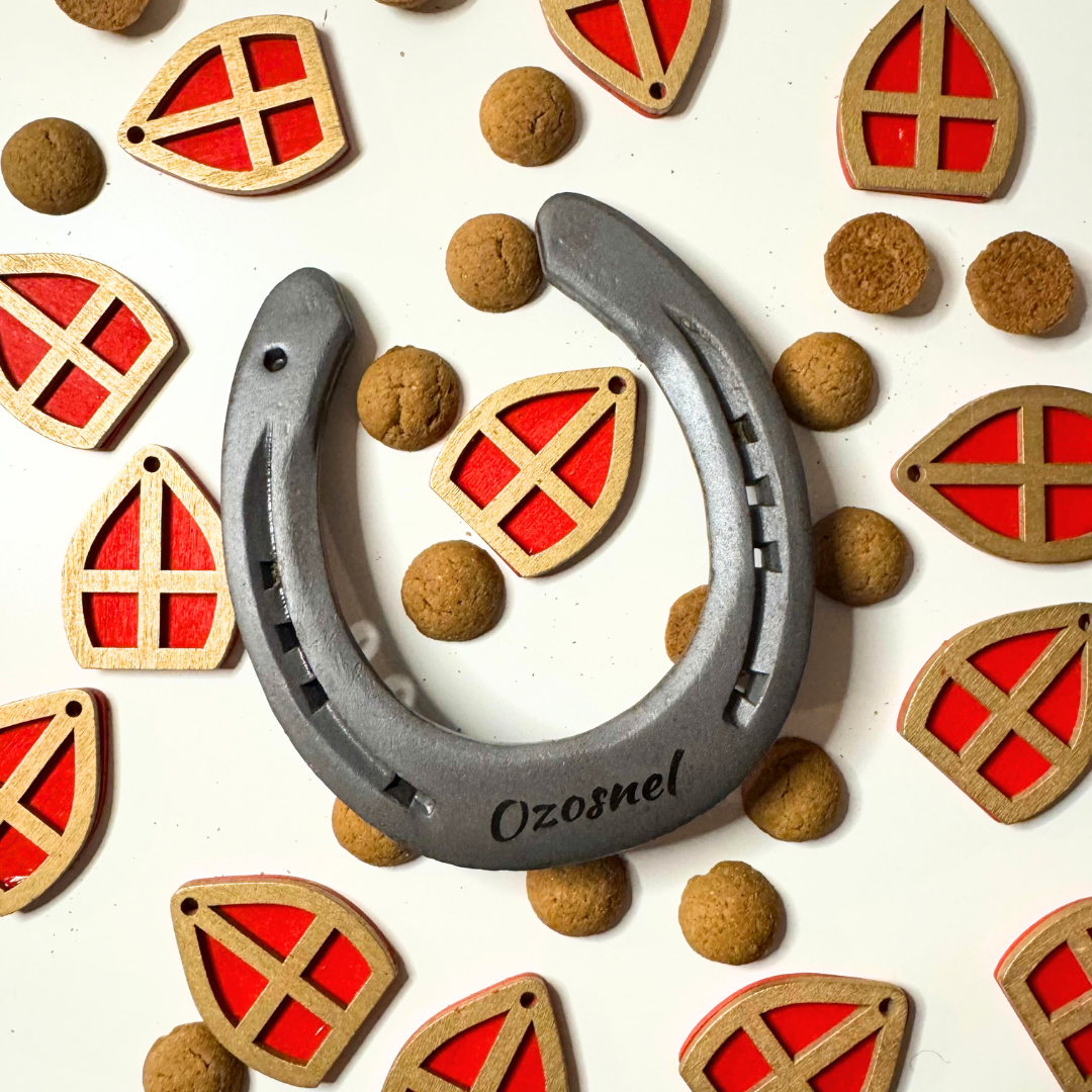 Hulp-sinterklazen opgelet: Wij hebben Sinterklaas een handje geholpen en het hoefijzer van Ozosnel schoongemaakt en zijn naam erop gezet. Bestel hem nu als perfect schooncadeautje.